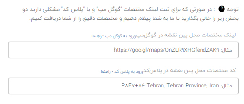 در صورتی که میتوانید از گوگل مَپ، لینک و یا از پلاس کُد، کُدِ محل مورد نظر برای پین در نقشه را ارسال کنید، اطلاعات را در این قسمت وارد فرمایید.