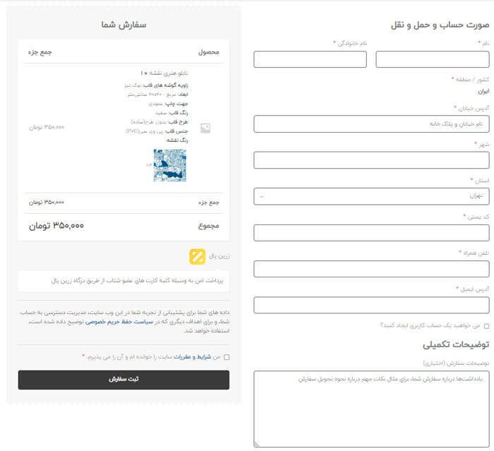 در این محل اطلاعات خود و آدرسی(دقیق) که می‌خواهید محصول به آنجا ارسال شود را بنویسید.